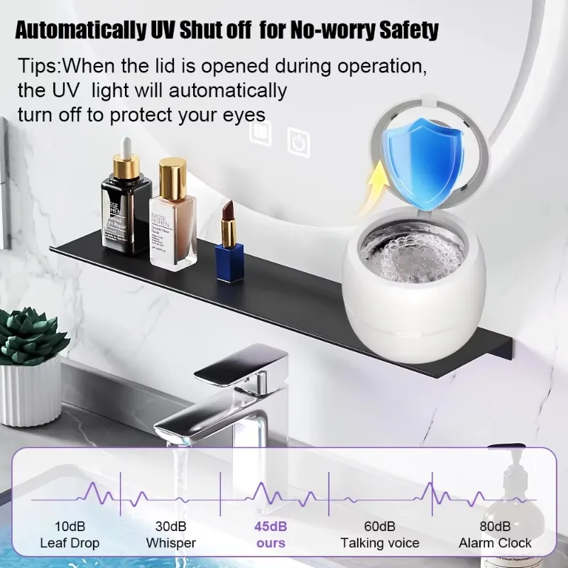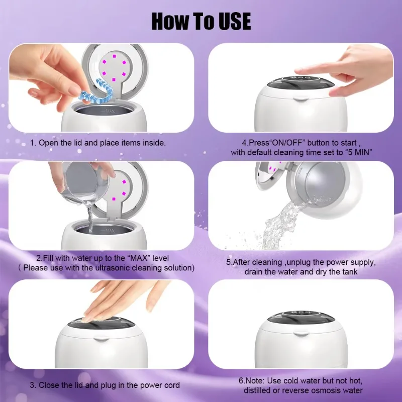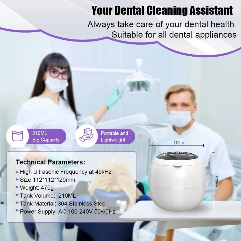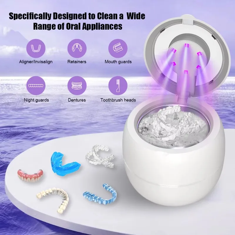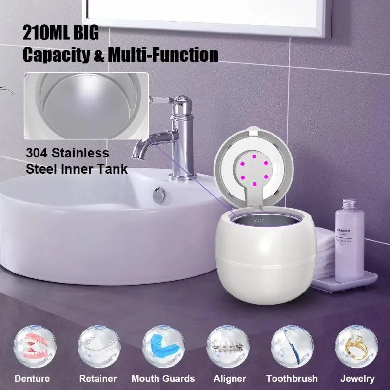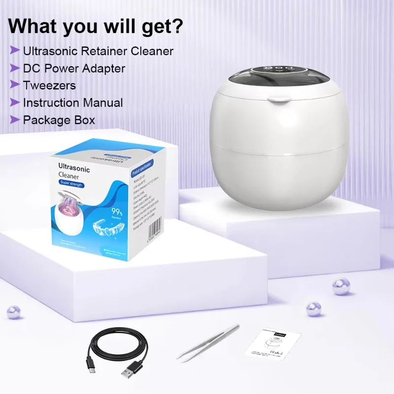 High-performance ultrasonic waves, diverse cleaning options: Our ultrasonic retainer cleaner adopts 25W high-efficiency power and 48kHz ultrasonic frequency technology, providing 360-degree all-round deep cleaning for retainers, dentures, night guards and braces. It is also very suitable for cleaning delicate items such as jewelry, rings and waterproof watches. It can easily remove hard-to-reach areas and dirt without damaging your valuables. For more effective results, you can use it together with cleaning tablets, mouthwash or other detergents. Customizable cleaning modes and dual technologies: This retainer cleaner features four timers of 1.5/3/6/8 minutes and adopts dual cleaning technologies of ultrasonic and LED lights, allowing you to deeply clean items as needed. The addition of LED lights further enhances the cleaning effect, capable of removing stubborn dirt and odors, sterilizing, and ensuring that your items are not only clean but also safe to use. It is applicable to all kinds of daily necessities, ranging from dental instruments to personal accessories. Silent operation, transparent cover design: This ultrasonic retainer cleaner is designed to minimize noise and ensure a quiet and peaceful cleaning process. The lid can prevent water from overflowing and dirtying the desktop, and also prevent water from vibrating during the cleaning process. The digital countdown panel and transparent cover allow you to check the remaining cleaning time and the internal cleaning status at any time. The bottom is also equipped with anti-slip rubber rings, which can maintain a stable and clean environment.